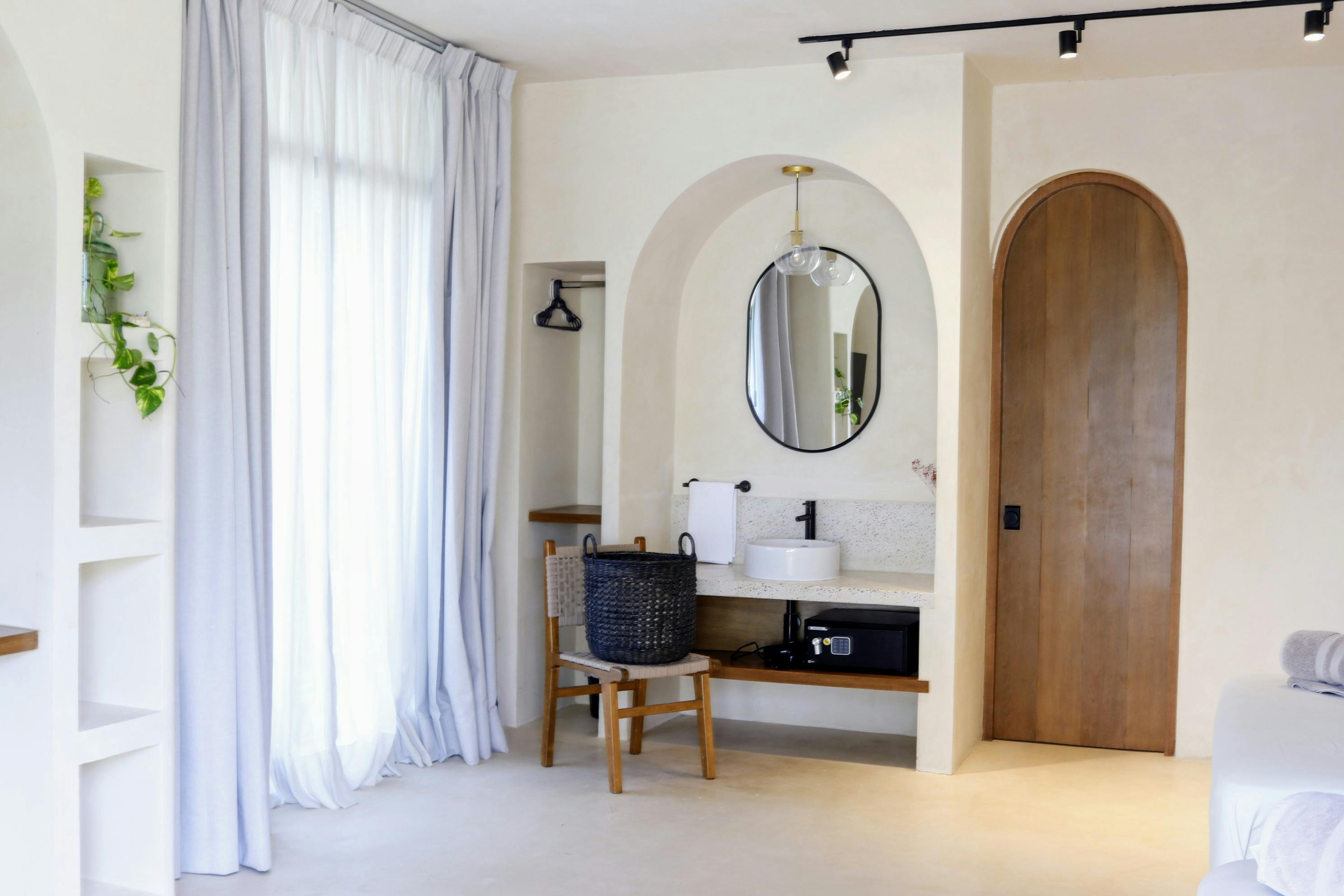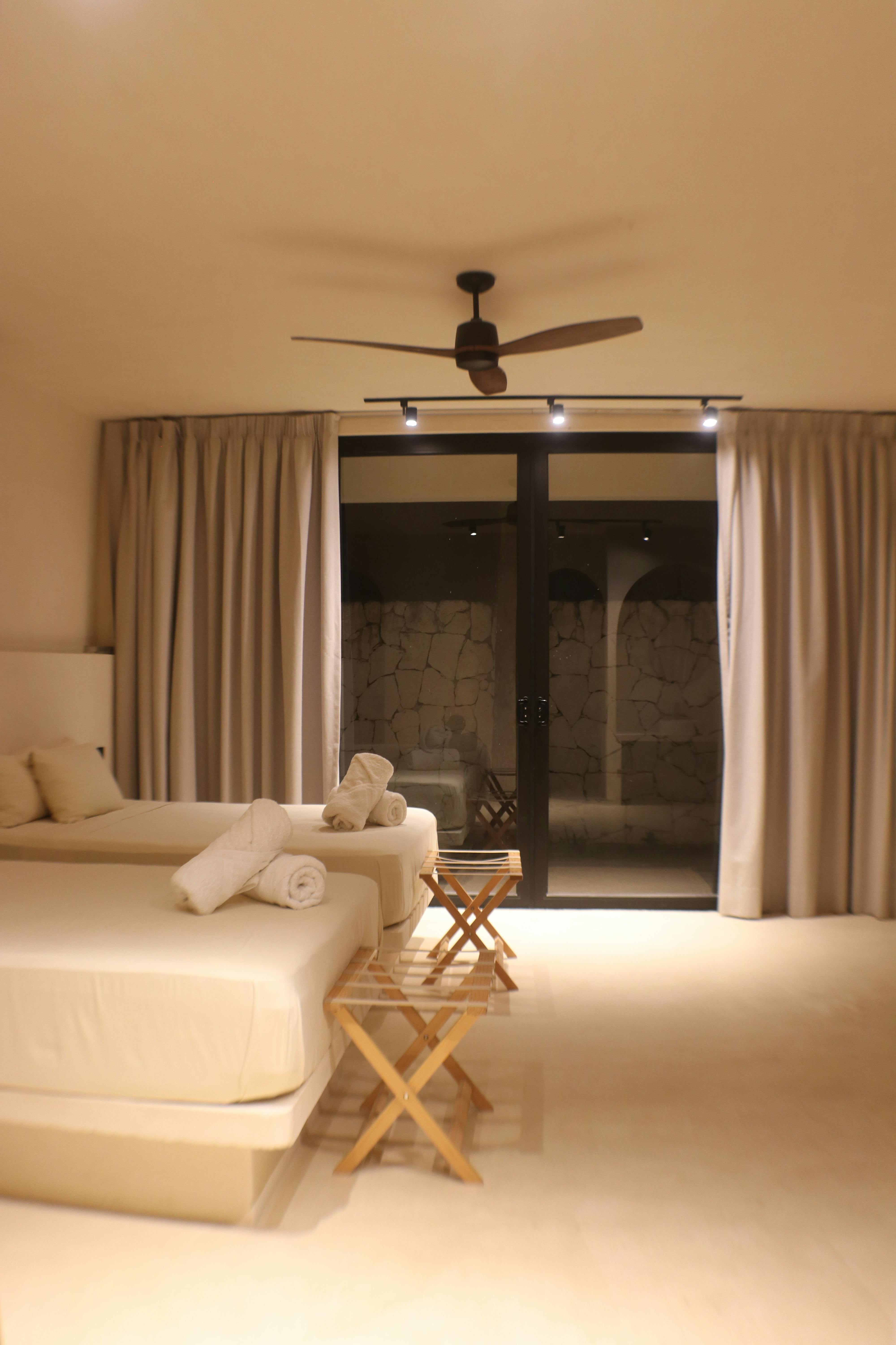 Esta habitación espaciosa ofrece confort y frescura con grandes ventanales de vidrio que permiten que entre la luz natural y la brisa del exterior, creando un ambiente relajante.